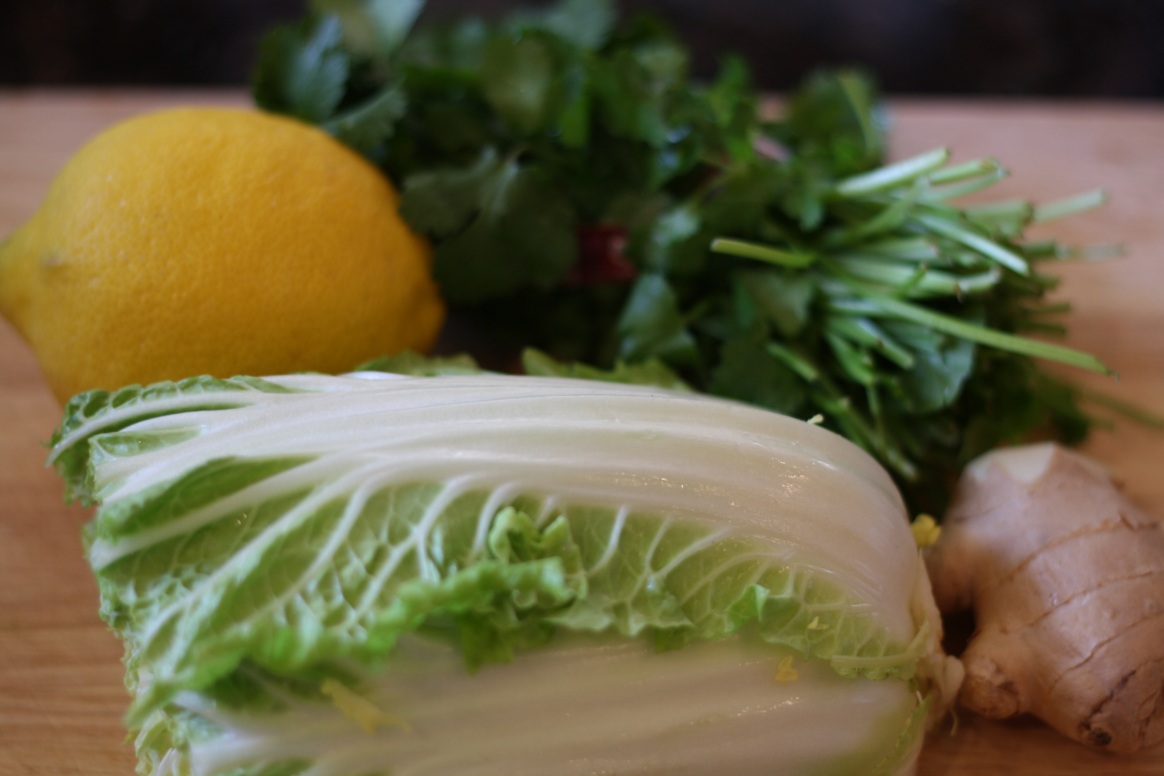 Heat peanut oil in heavy large wok or non-stick skillet over medium-high heat.  Add cabbage, ginger, garlic and mushrooms.  Stir-fry until cabbage wilts, add green onion pieces, toss until green onions wilt.  Remove from heat and add 1 tablespoon soy sauce.