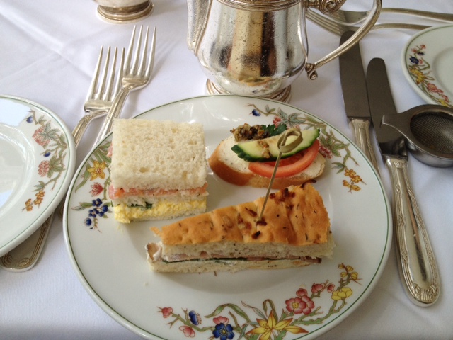 Next came a plate of dainty tea sandwiches. Salmon lox and egg salad in the upper left; cucumber, tomato and olive tapenade with cream cheese on a baguette in the upper right; and a roast beef and watercress on rosemary focaccia on the bottom. The baguette with cucumber, tomato and olive tapenade was my favorite.