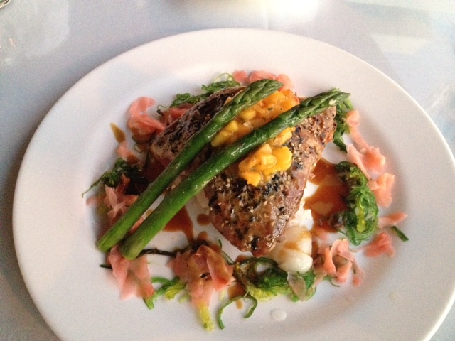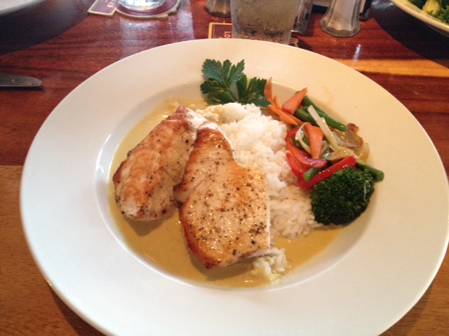 They always have a few fresh fish selections and it is nice because they offer them prepared three ways. I chose the Thai green curry sauce, but it was also offered with a lemon caper sauce or on a bed of greens with green papaya and a peanut miso vinaigrette (what Hubby ordered).