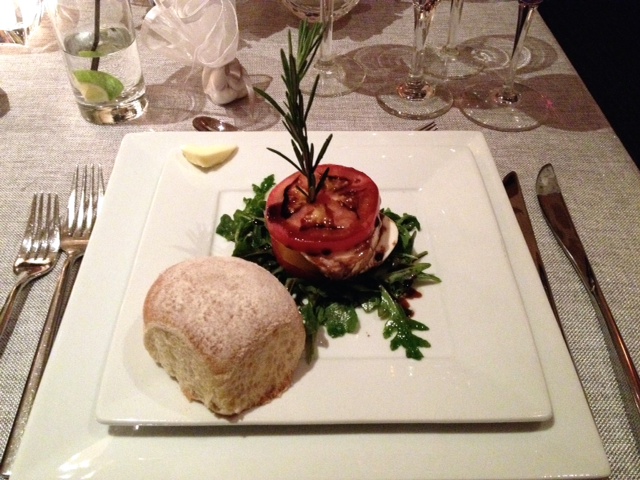 First course of dinner, caprese salad with dinner roll.