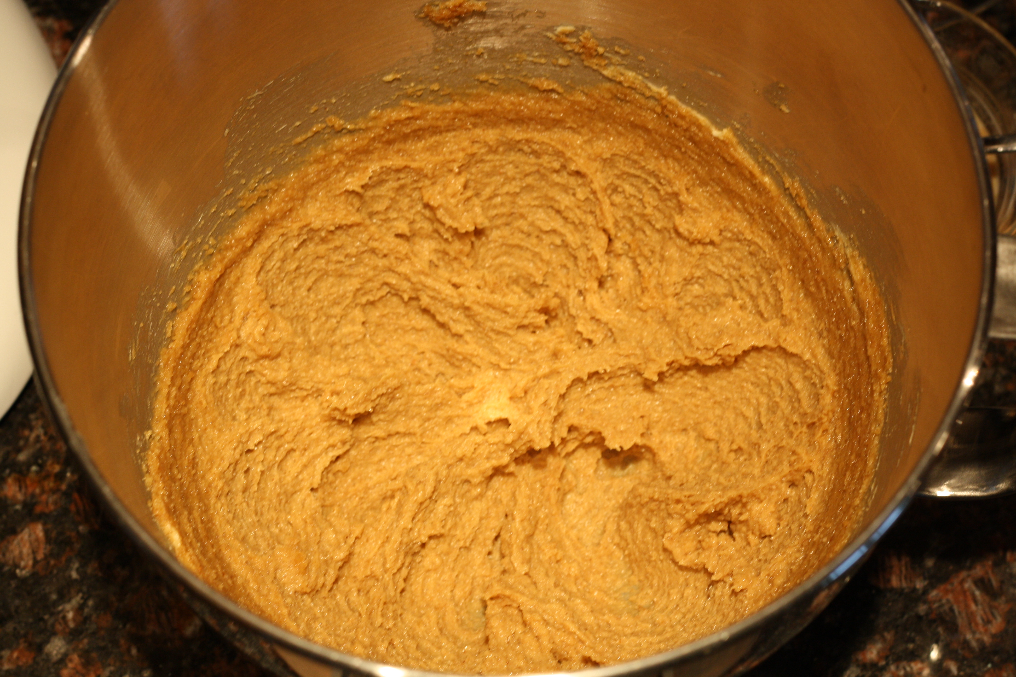 3. Cream together the butter, white sugar, peanut butter and brown sugar until fluffy. Beat in the egg, vanilla and milk. Add the flour mixture; mix well.