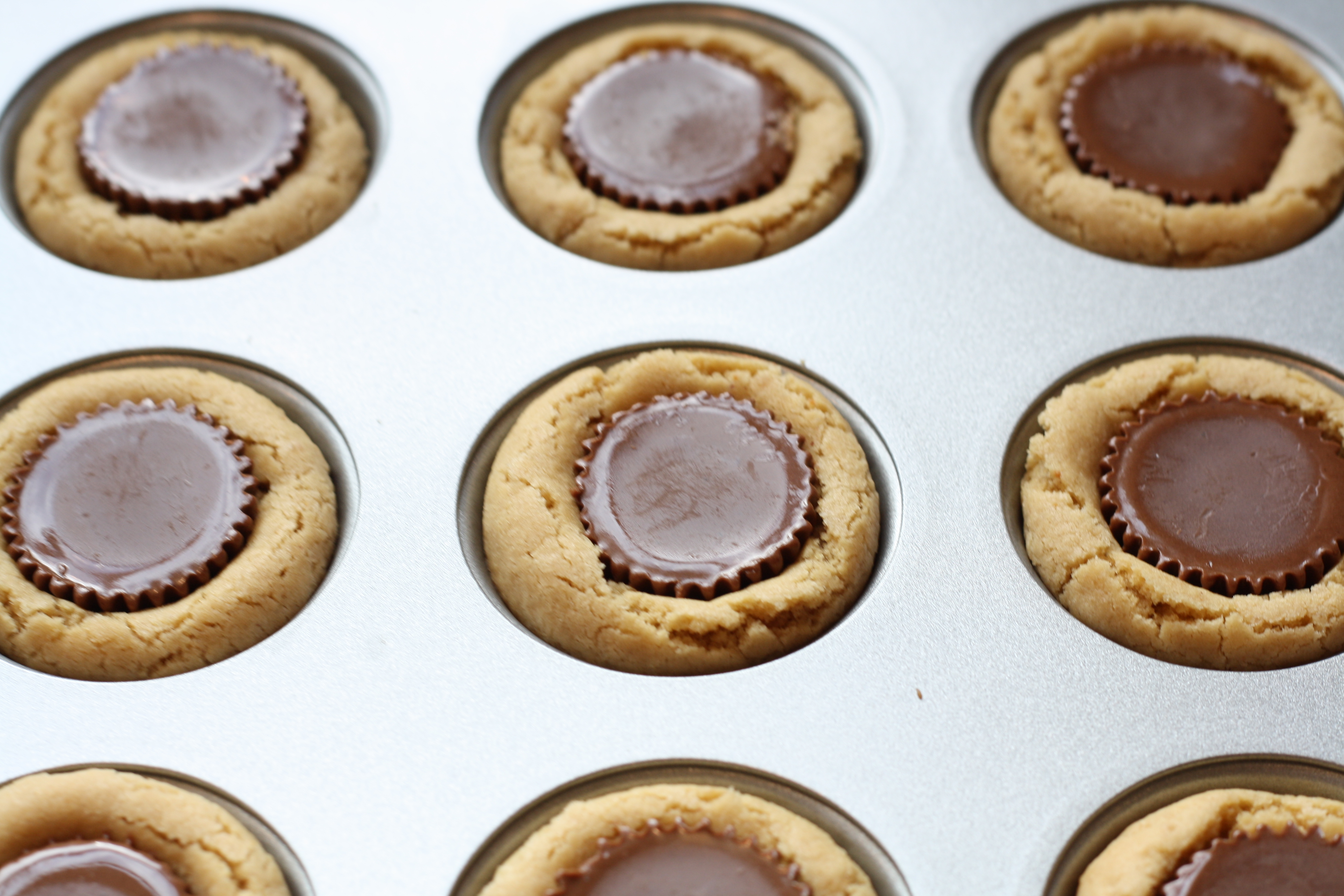 5. Bake at 375 degrees for 8 min. Remove from oven and immediately press a mini peanut butter cup into each ball. Cool and remove from pan.
