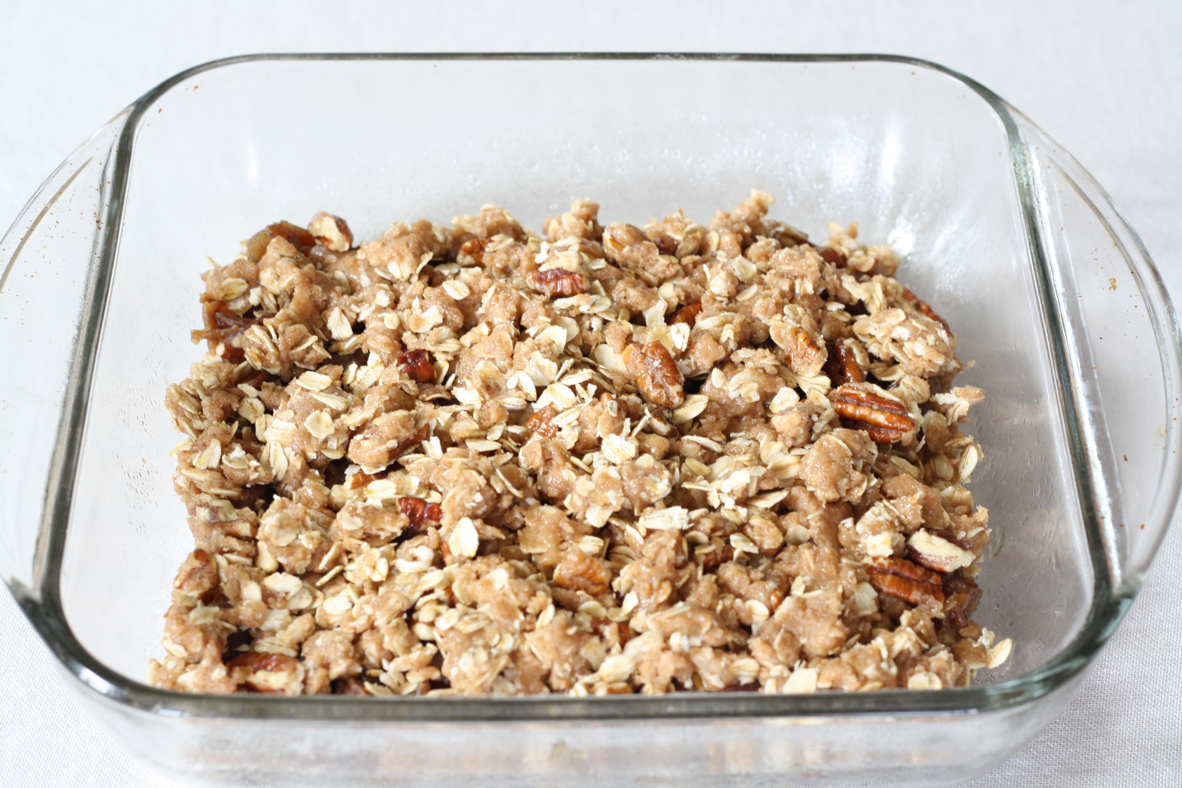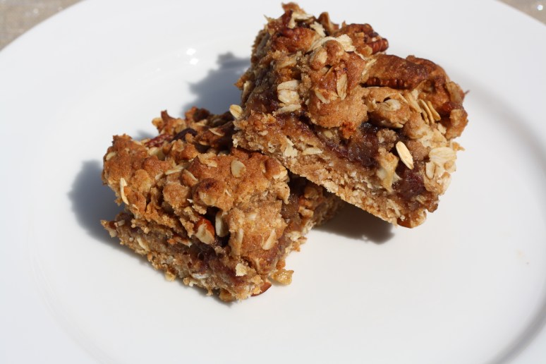 Mix the ingredients listed above and spread half on the bottom of a greased 8×8 inch pan (pat down into what will be the bottom crust). Spread with date filling and crumble the rest of the oat mixture on top.