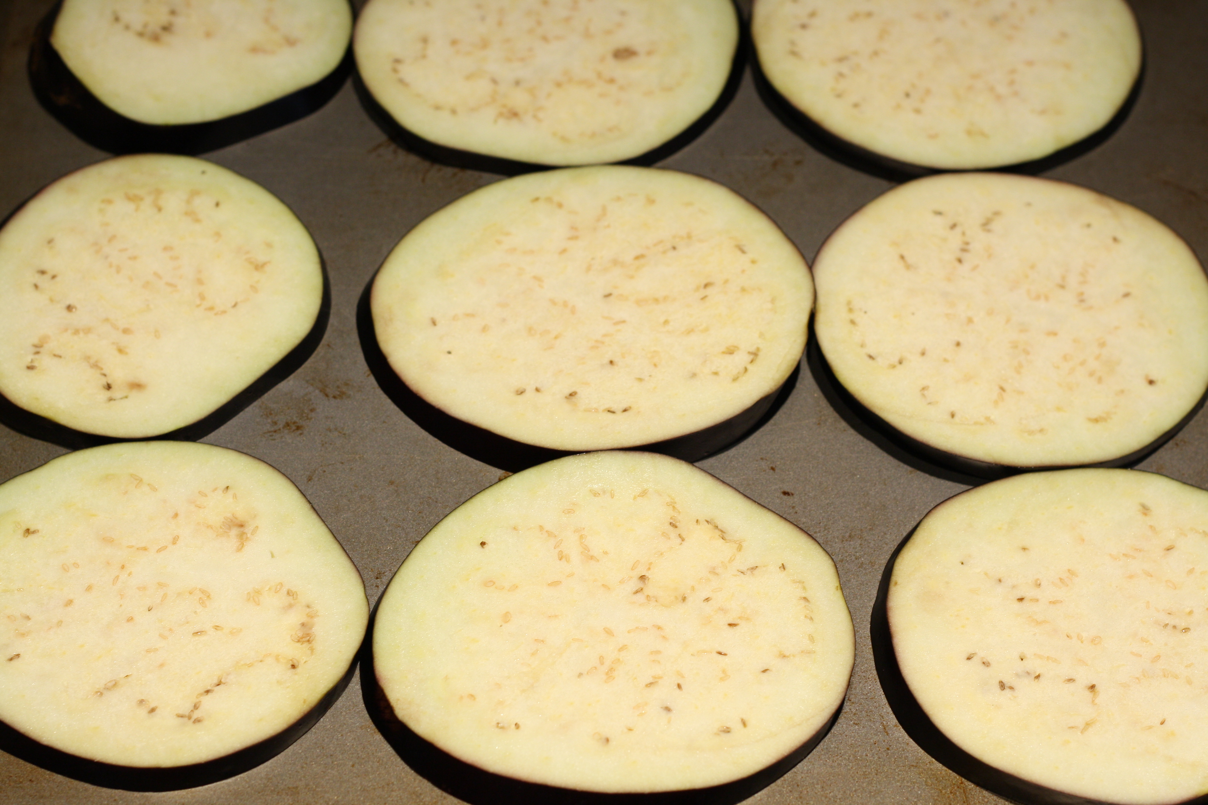 - 1 large eggplant, cut into 1/2 inch rounds, roasted in the oven at 350 degrees for approximately 15-20 minutes