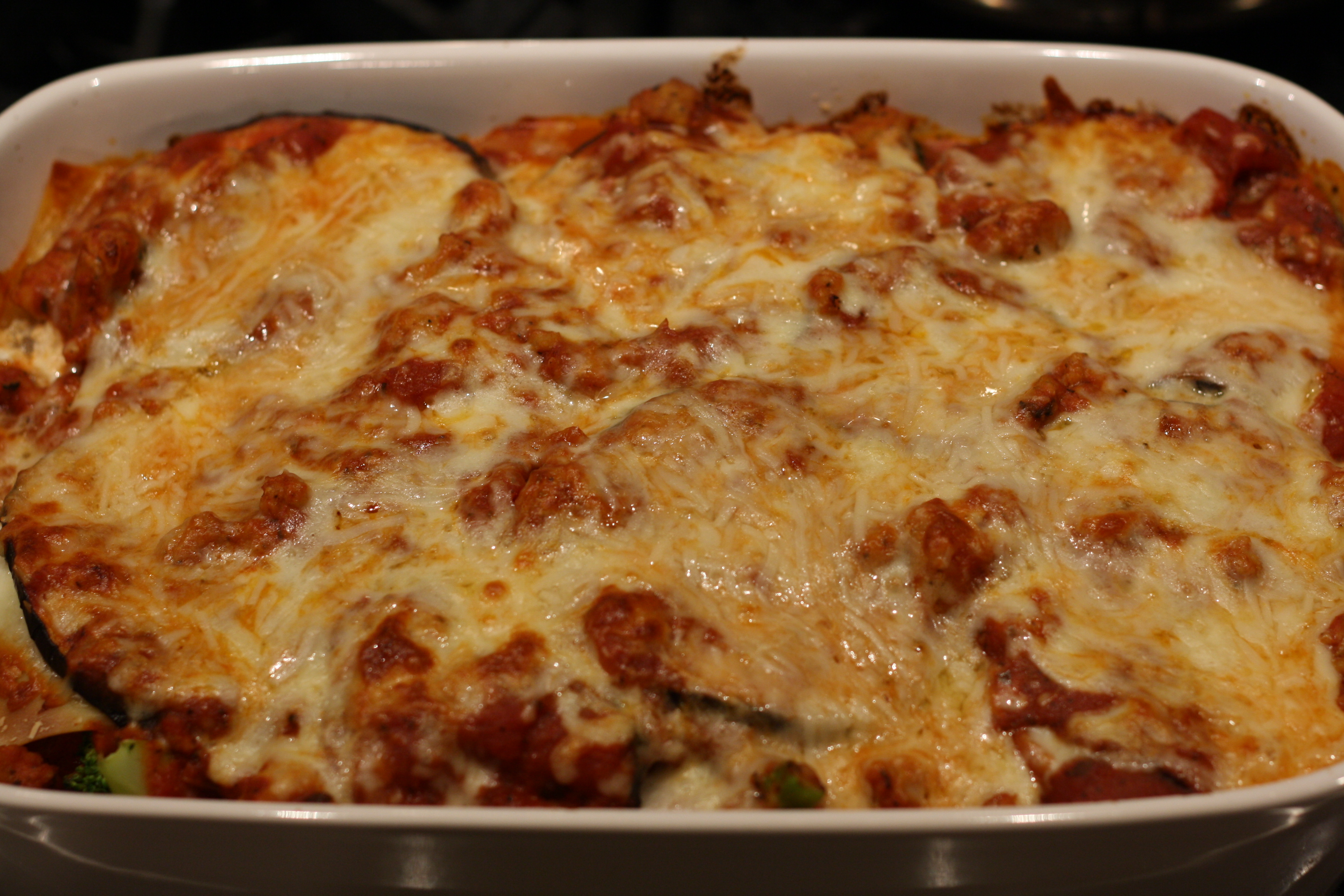 3. Use a large 9×13 inch pan. Start with marinara sauce/chicken Italian sausage on the bottom of the pan, next layer the no boil noodles, followed by ricotta cheese (crumbled on top), and mozzarella. Add a layer of eggplant. Repeat sauce, noodles and cheese and then add a layer of the steamed broccoli. For the third layer, go back to the eggplant. Finish the last eggplant layer with sauce, mozzarella cheese and parmesan.