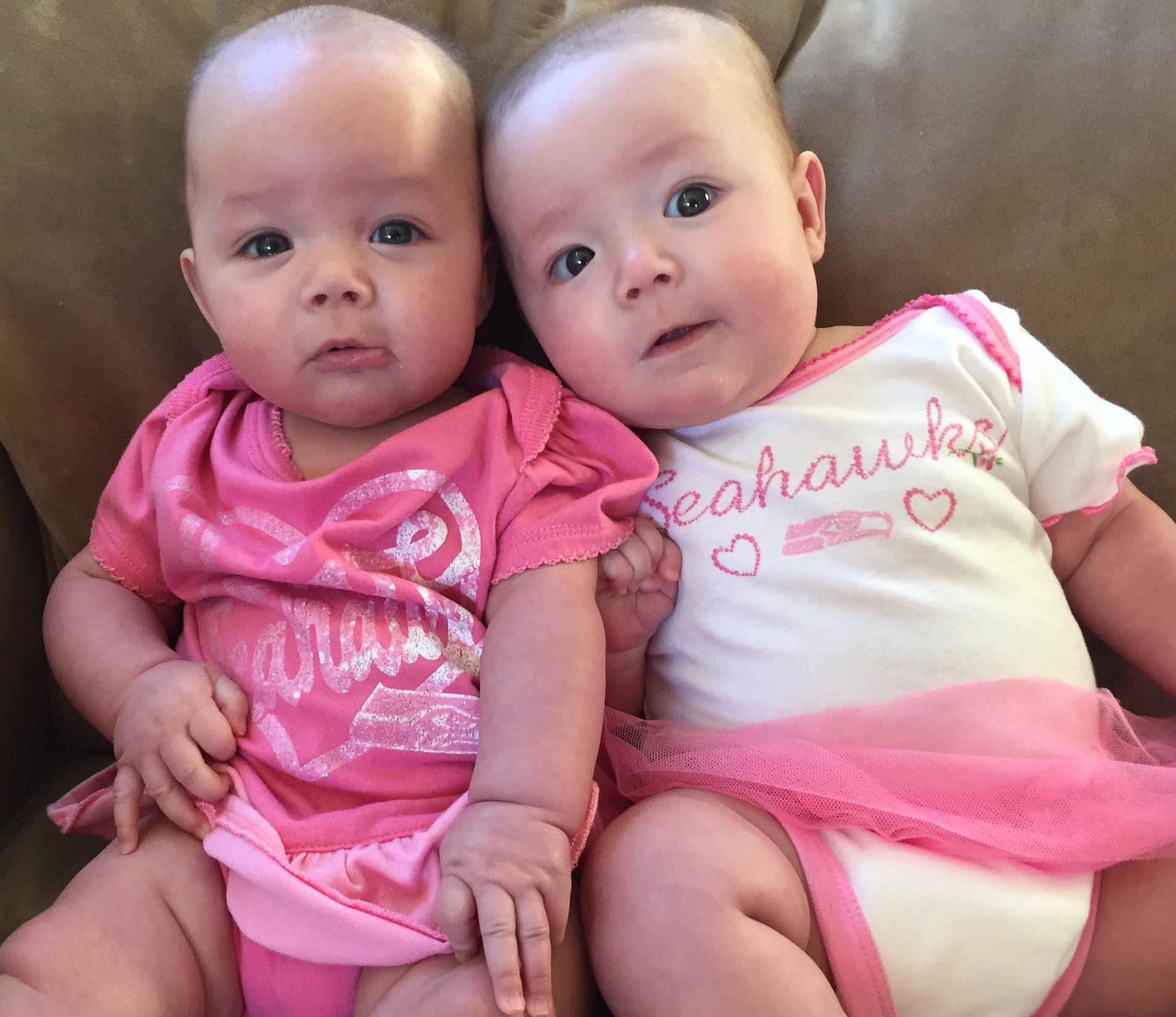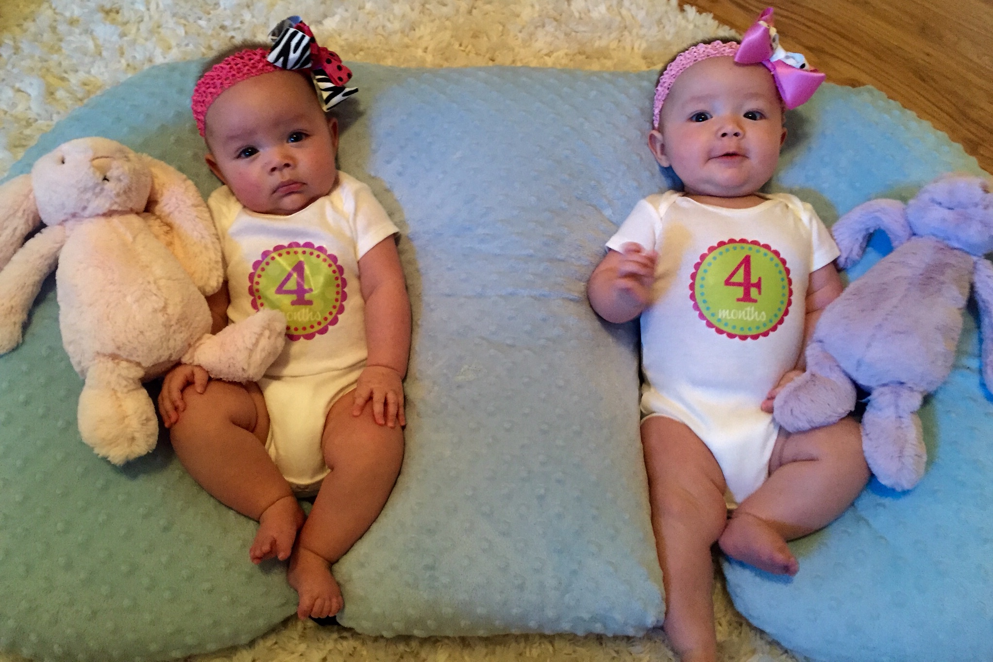 At four months, Jemma and Zoe are so much fun.  We are constantly getting wide grins, occasional laughs, eyes of wonder, and snuggles.