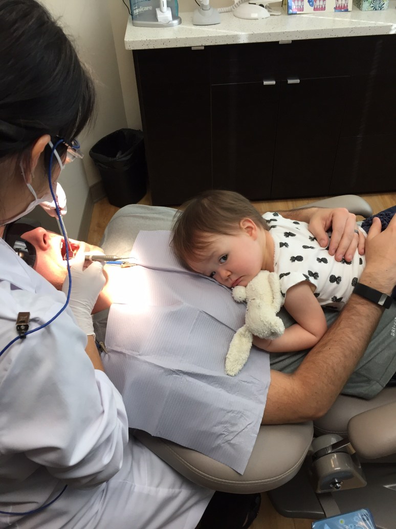 Jemma laying with Daddy while he gets his dental exam from Mommy.